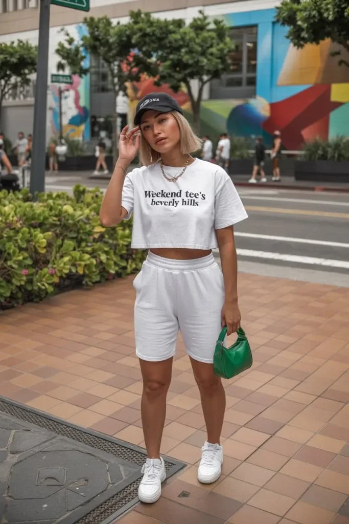 To make it feel more styled, add a crossbody bag and clean white sneakers. This kind of Biker Shorts Outfits Summer look is perfect for coffee runs, errands, and days when comfort comes first.
