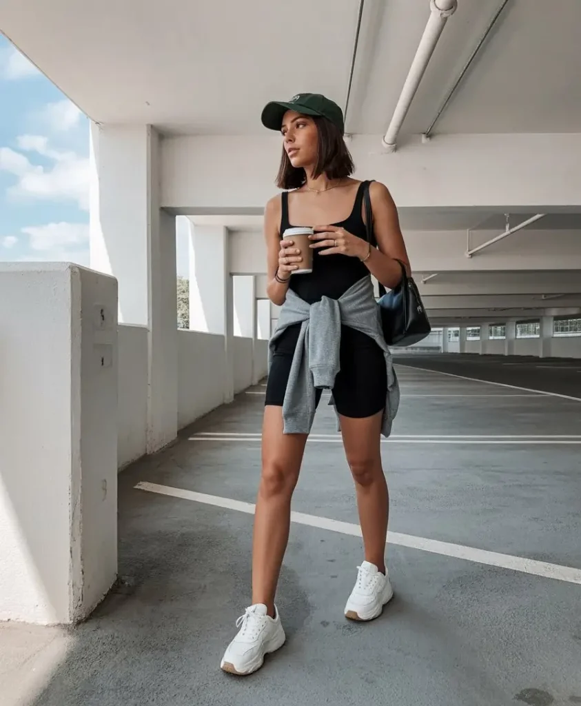 A fitted black top and biker shorts look sleek, and a sweatshirt tied at the waist adds a cool detail. It also gives your outfit shape and makes it feel styled.