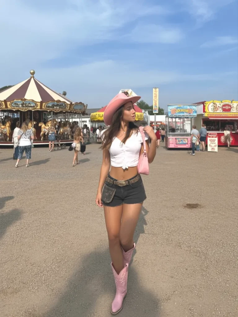 This look is fresh, simple, and perfect for warm weather. A white crop top with denim shorts always looks stylish. Brown cowboy boots and a matching hat make the outfit feel more western and complete.