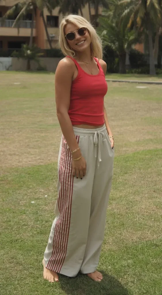 A fitted tank with loose track-style pants is an easy win. The top feels neat and sporty, while the pants keep you cool and comfortable when it’s too hot to wear anything tight.