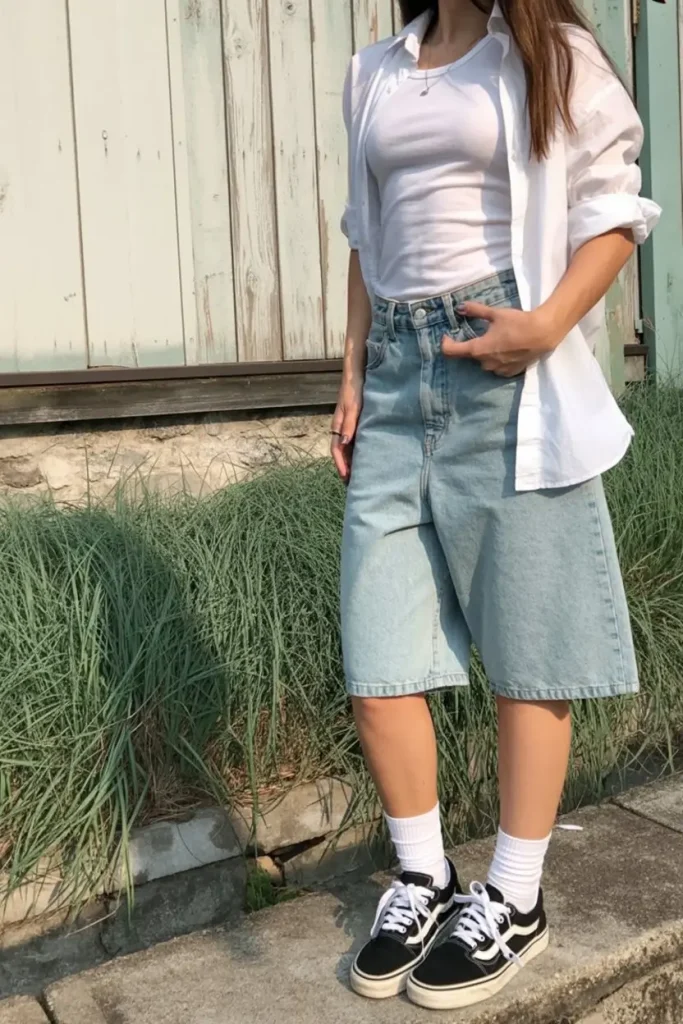 10. Layered White Shirt And Denim Shorts Casual Cool