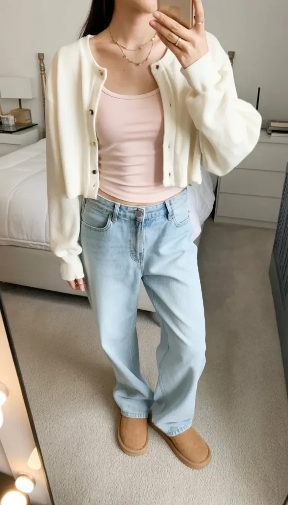 16. Soft Pastel Cardigan And Jeans Clean Girl Comfort