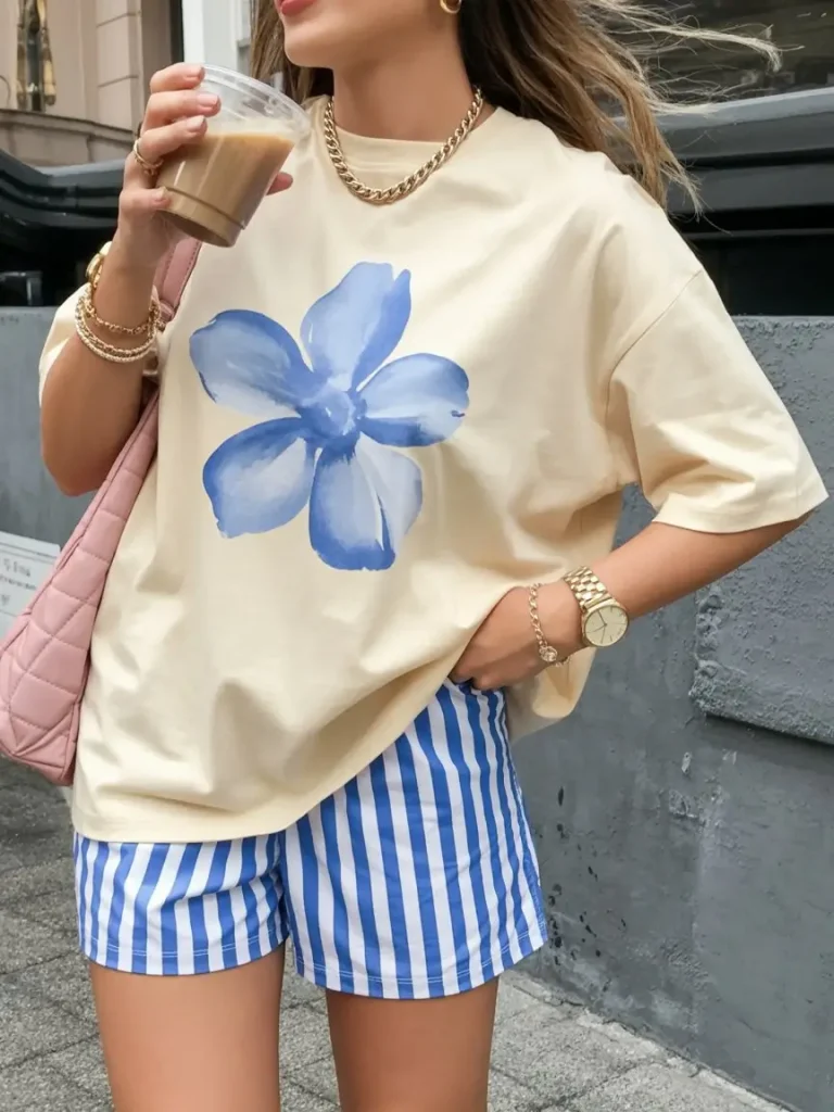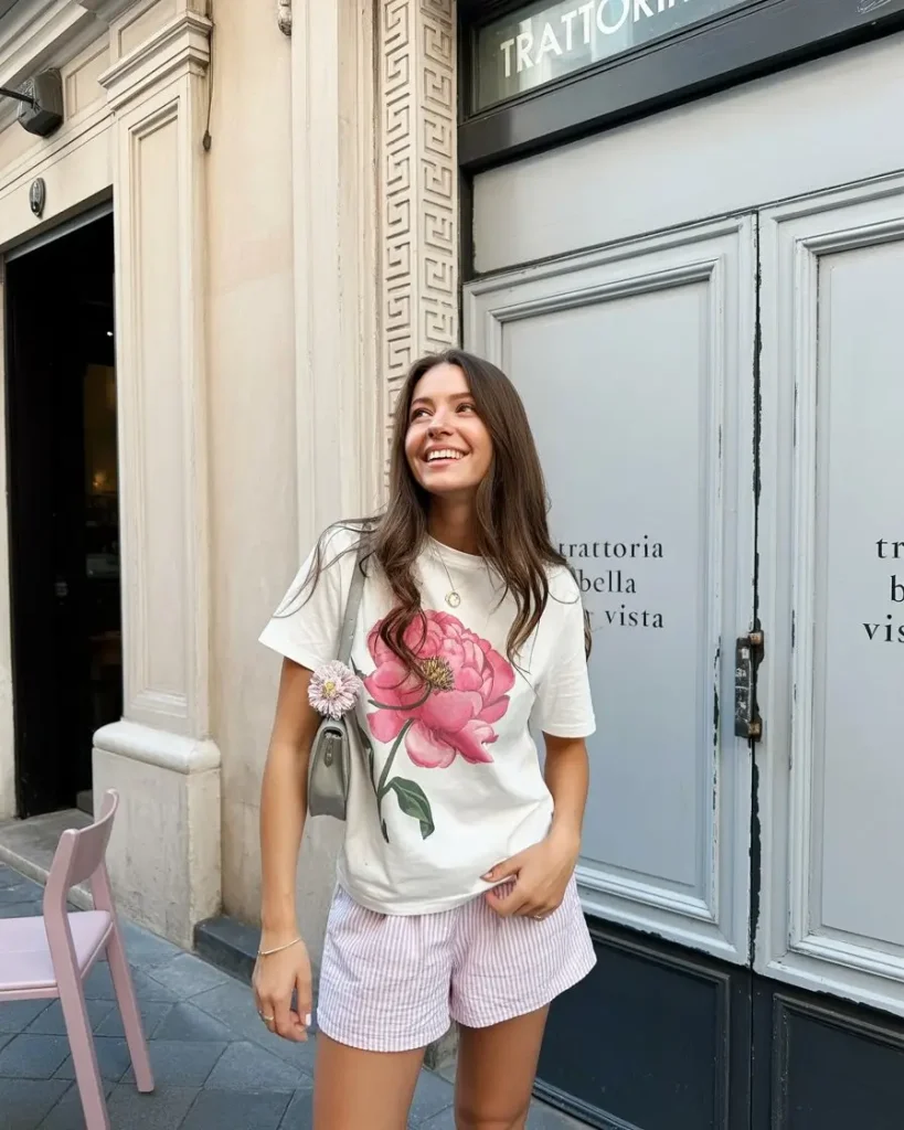 An oversized floral tee with lightweight striped shorts feels relaxed and happy. It’s the kind of outfit you wear on slow mornings or quick errands.