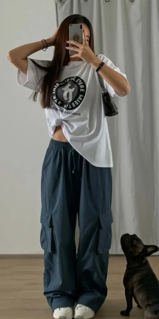 An oversized graphic tee with loose cargo pants gives you an easy streetwear look. It feels effortless, but it still looks current.