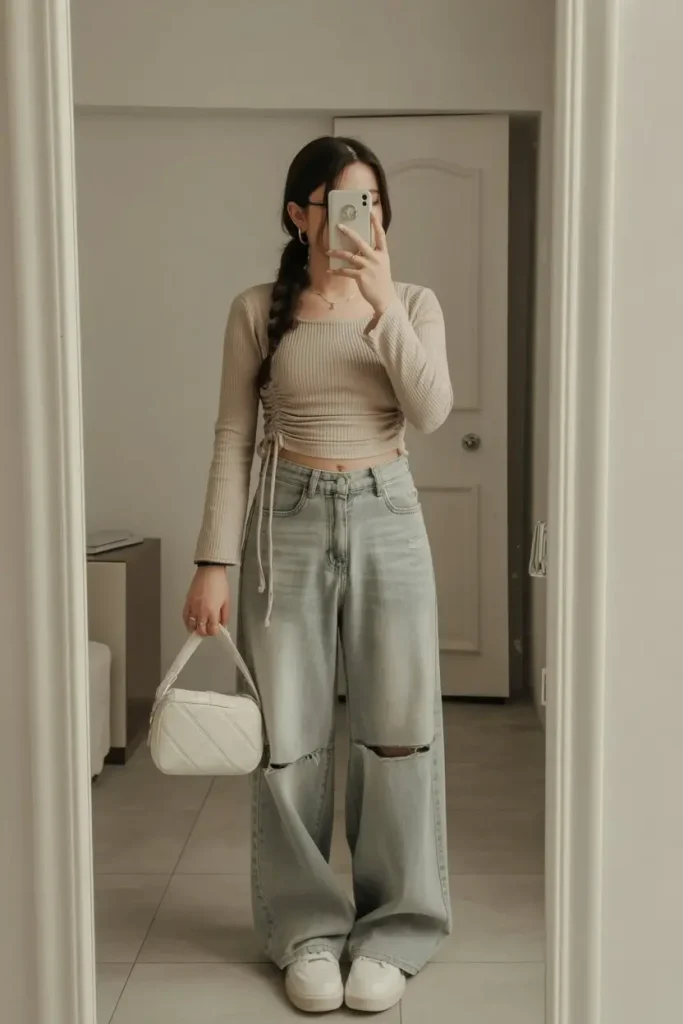 A fitted neutral long-sleeve top with loose ripped jeans feels calm and confident. The colors are simple, but the ripped denim adds personality.