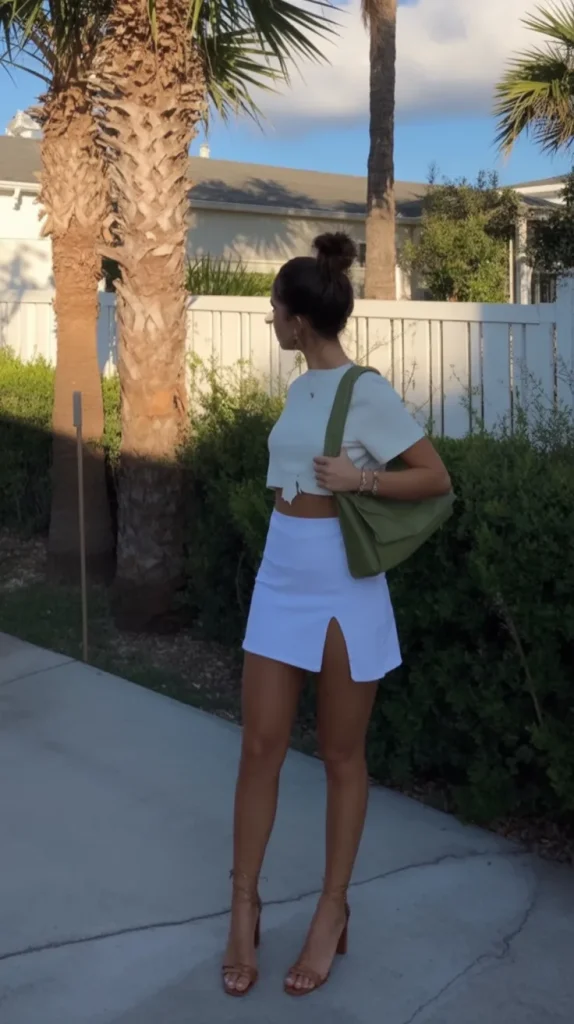 A minimal outfit can look very strong and stylish. A simple white top with a clean skirt or wide-leg pants creates a modern and fresh feel.