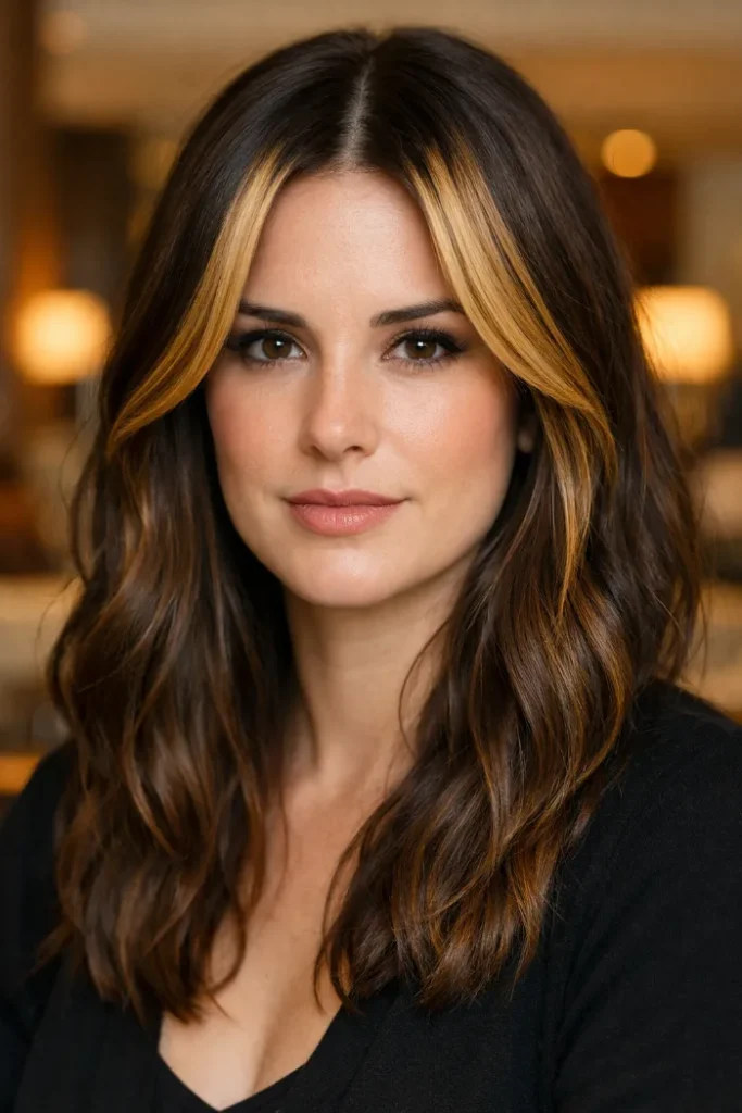 Ask for long layers and bold, front highlights starting near the hairline. Style loose waves so those lighter pieces fall forward and soften the upper face.