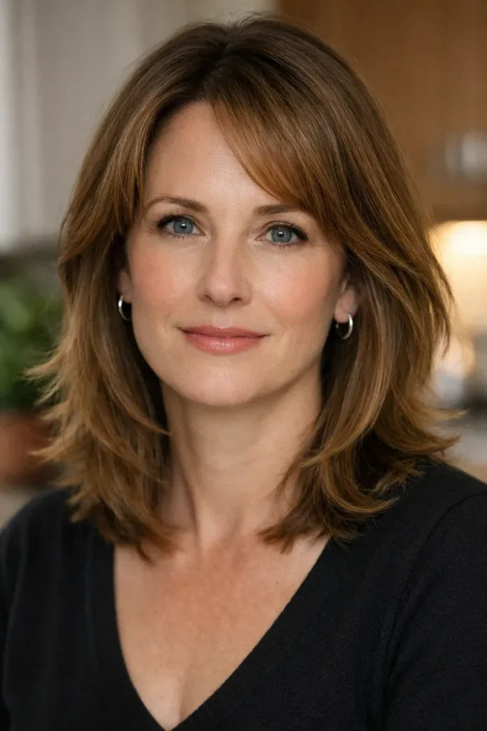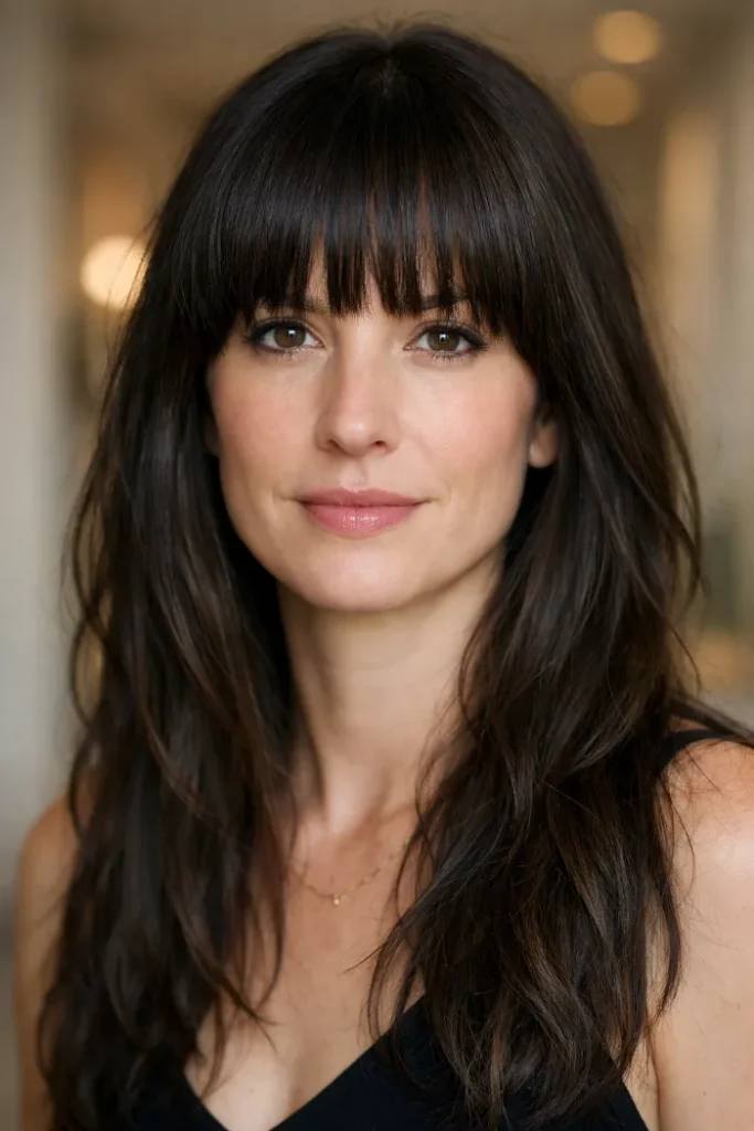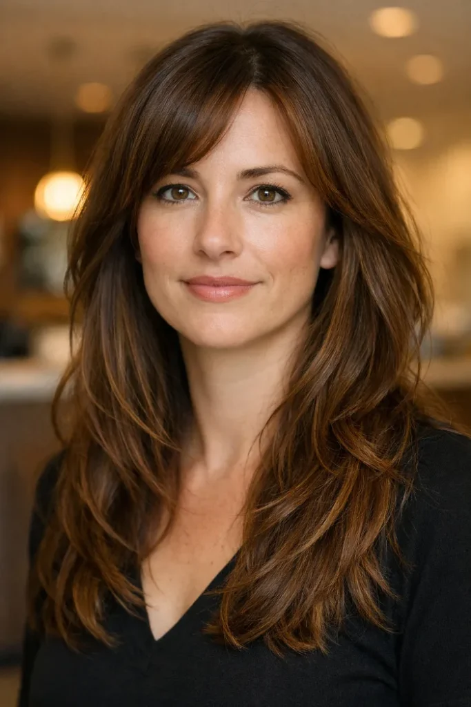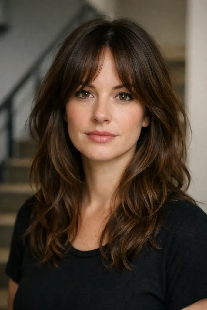 Ask for long layers with thin, wispy bangs that blend into the front pieces. Keep the fringe light so it doesn’t turn thick or blocky.