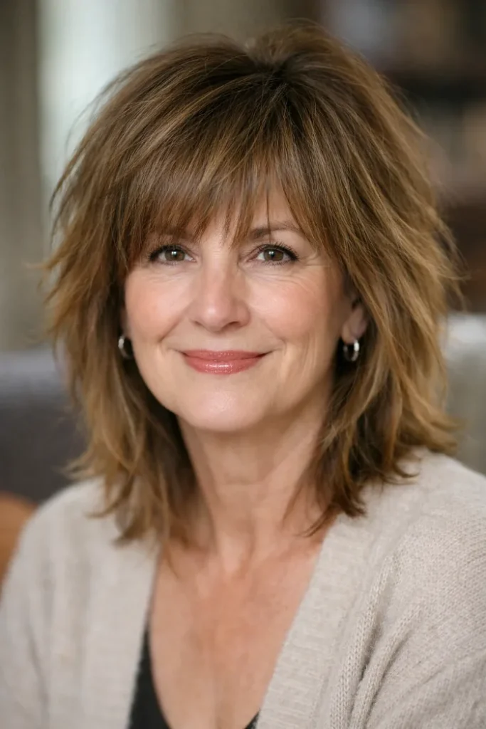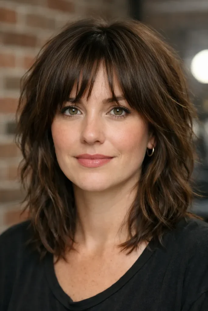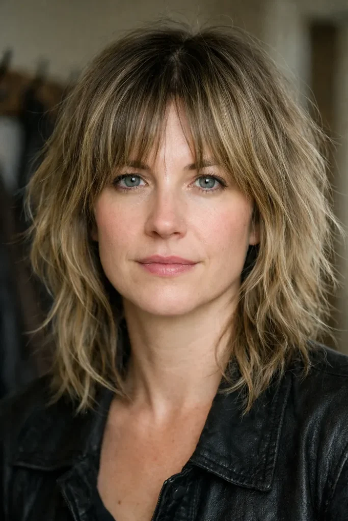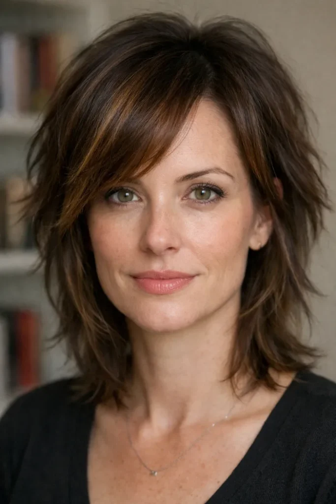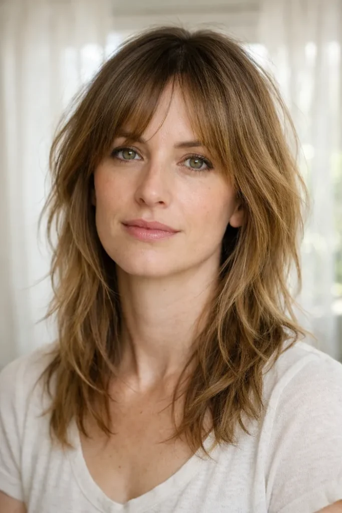 Long side-swept pieces cross the forehead without forming a straight line. The shag texture adds movement, which keeps the face from looking “top heavy.”