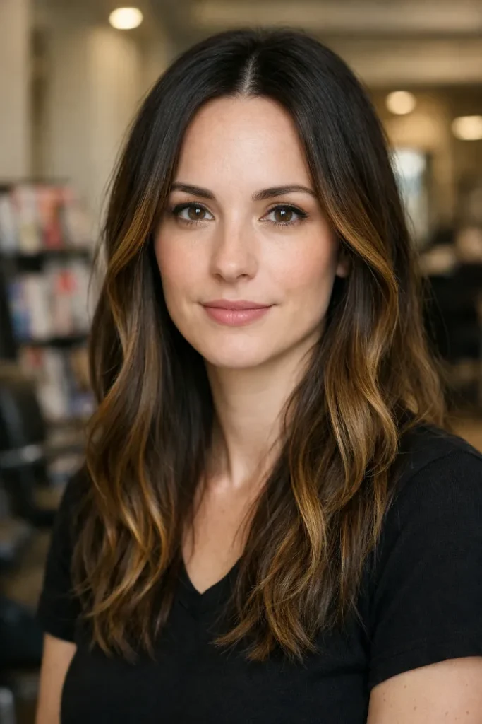 Ask for long layers and subtle balayage placed mainly around the face. Add relaxed bends in the front sections so they curve along the cheeks, not straight back.