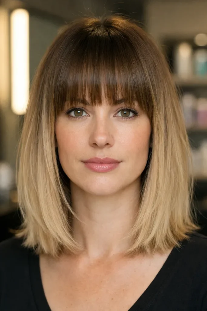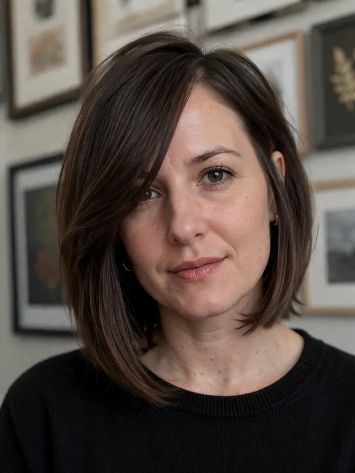 Ask for a collarbone-length lob with long, side-swept bangs and light front layering. Blow-dry the bangs across the forehead so they sit airy, not flat.