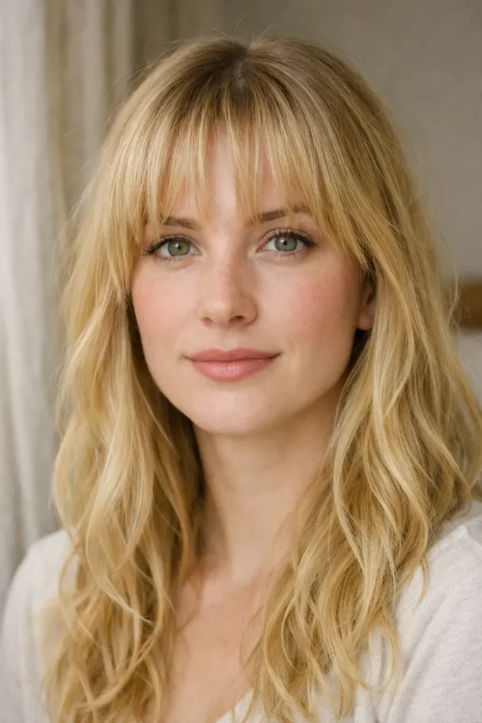 Ask for long curtain bangs that blend into face layers. Add soft waves and a little root lift so the bangs don’t fall flat.