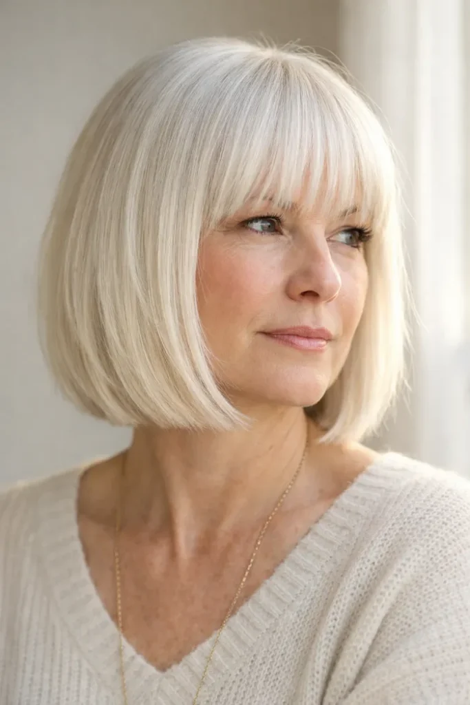 Ask for a jaw-length blunt bob with a full fringe and minimal internal layers. It’s a strong look, but still soft when the ends are kept clean.