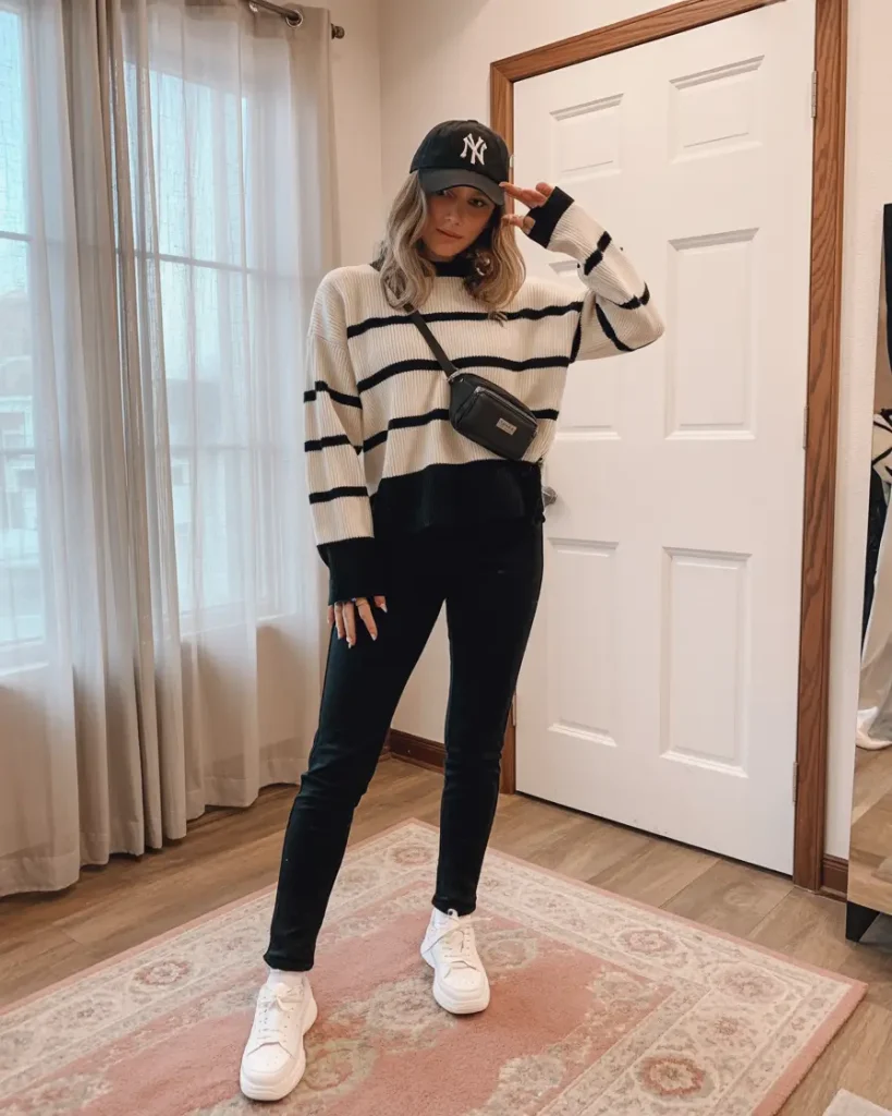 A striped sweater with black leggings is simple, but it always looks ready for the day. Add white sneakers to brighten the outfit and keep it feeling like spring, not winter.