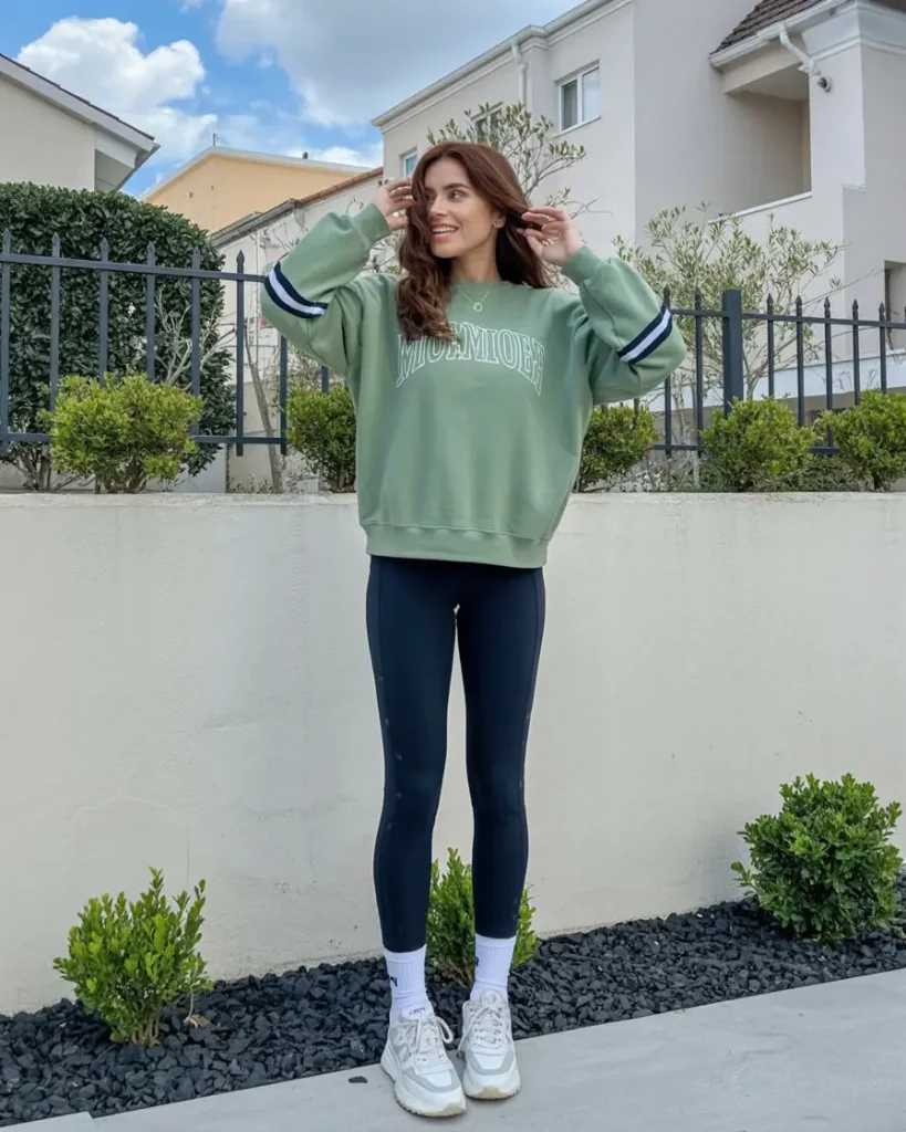 A soft green sweatshirt is an easy way to look more “spring” without trying hard. With black leggings and bright white sneakers, the outfit stays clean and fresh.