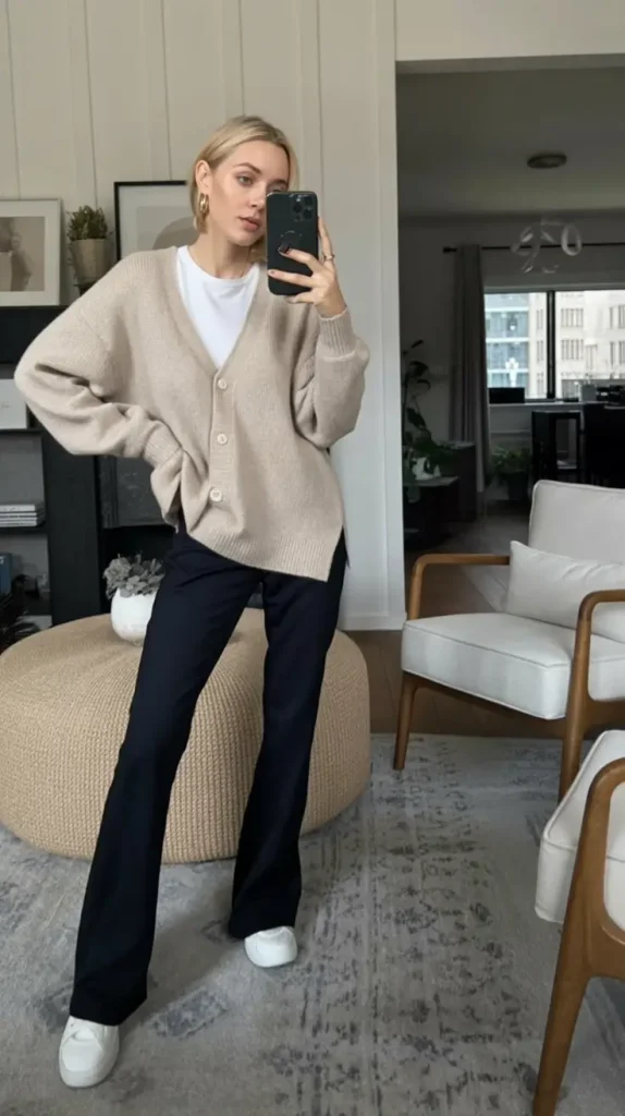This outfit is a nice choice for casual workdays or days when you want a relaxed shape. It also feels great for travel because it’s roomy and easy to layer.
