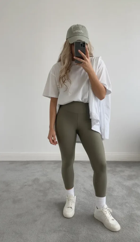 Olive leggings look earthy and calm, which fits spring perfectly. Pair them with an oversized white tee to keep the outfit clean and breathable.