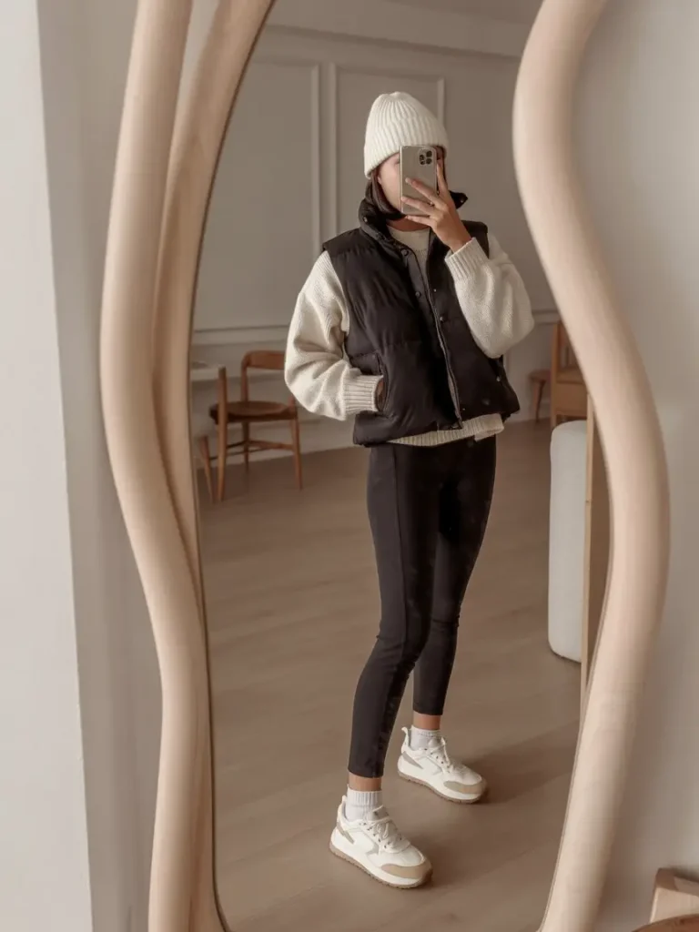 A puffer vest is perfect when you need warmth but don’t want heavy layers. Wear it over a soft knit with black leggings for an easy spring uniform.