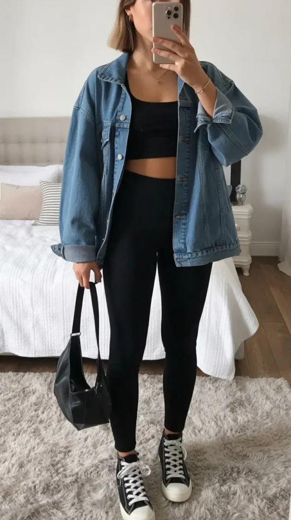 Black leggings with a slightly oversized denim jacket always look cool and grounded. A cropped black top keeps the outfit balanced once the weather starts warming up.