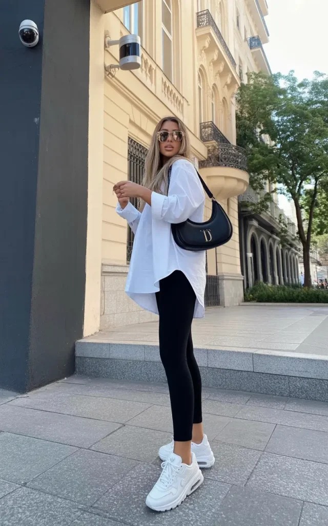 A crisp oversized white shirt over black leggings looks breezy and fresh. It’s comfortable, but it has that “put-together” feeling right away.