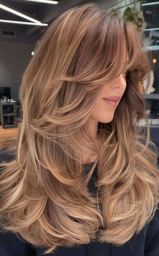 Bangs can also change the whole style. Curtain bangs blend into long layers and look soft and modern. Side-swept bangs are great if you want a simple change with easy styling. Always ask your stylist to keep the layers blended so the ends still look full and healthy.