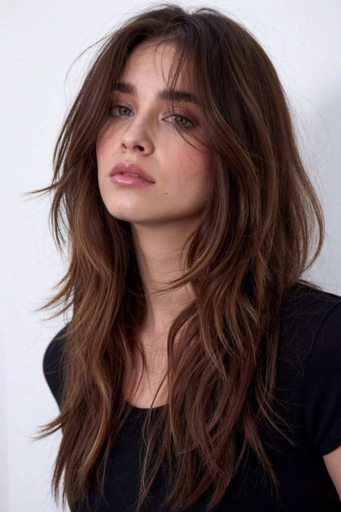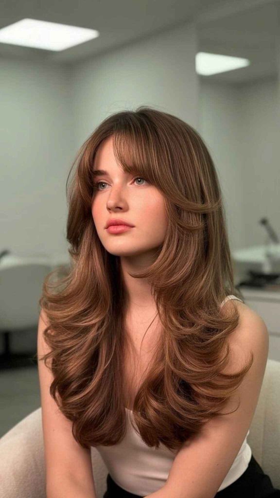 Long layered haircuts with long bangs give you a softer look without short fringe. The bangs sweep into the layers, so the haircut feels blended and easy to style.