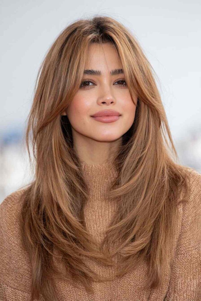 Long layered haircuts with curtain bangs give a soft frame around the face. The bangs blend into the front layers, so the style looks natural and easy, not too heavy.