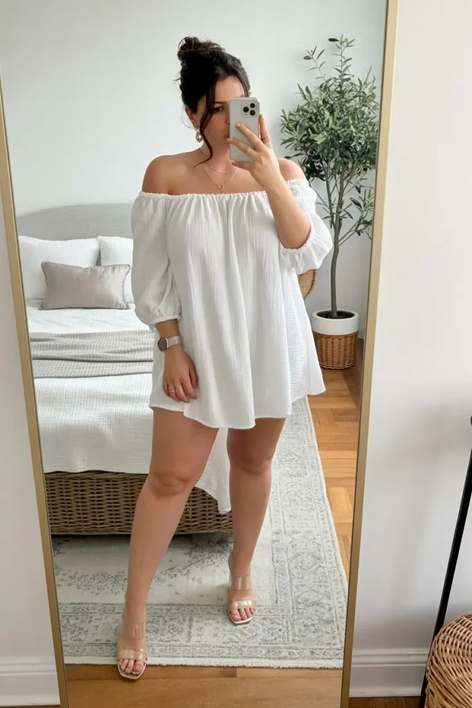 A loose off-shoulder white mini dress feels like pure summer—light, breezy, and comfortable. It doesn’t cling, which makes it easier to wear on very hot days.