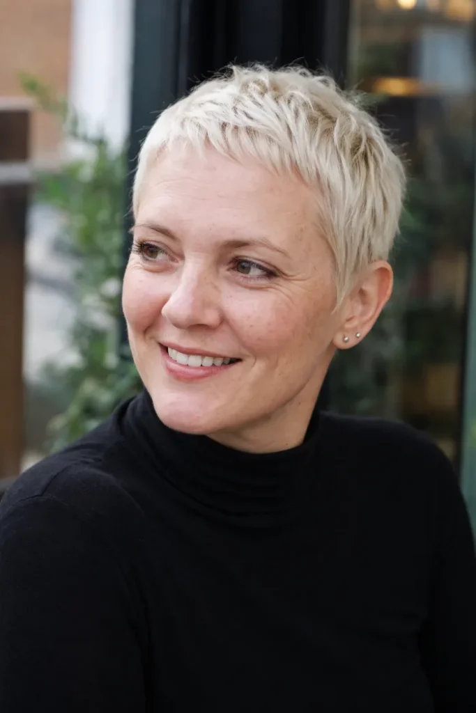 This pixie has a relaxed, lived-in look that doesn’t feel overstyled. The crown is slightly tousled, giving movement and a softer shape.