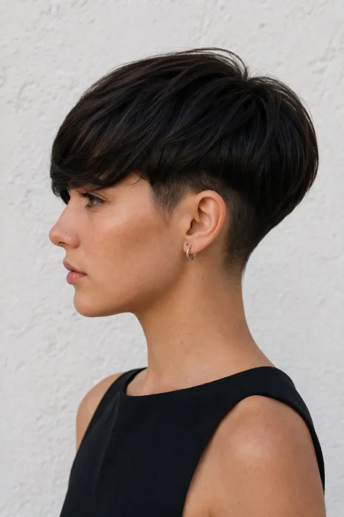 Jet black adds depth and makes the part line look sharp. For easy Short Pixie Cut Ideas that still look refined, ask for a close pixie with a soft side part and enough top length to brush flat.