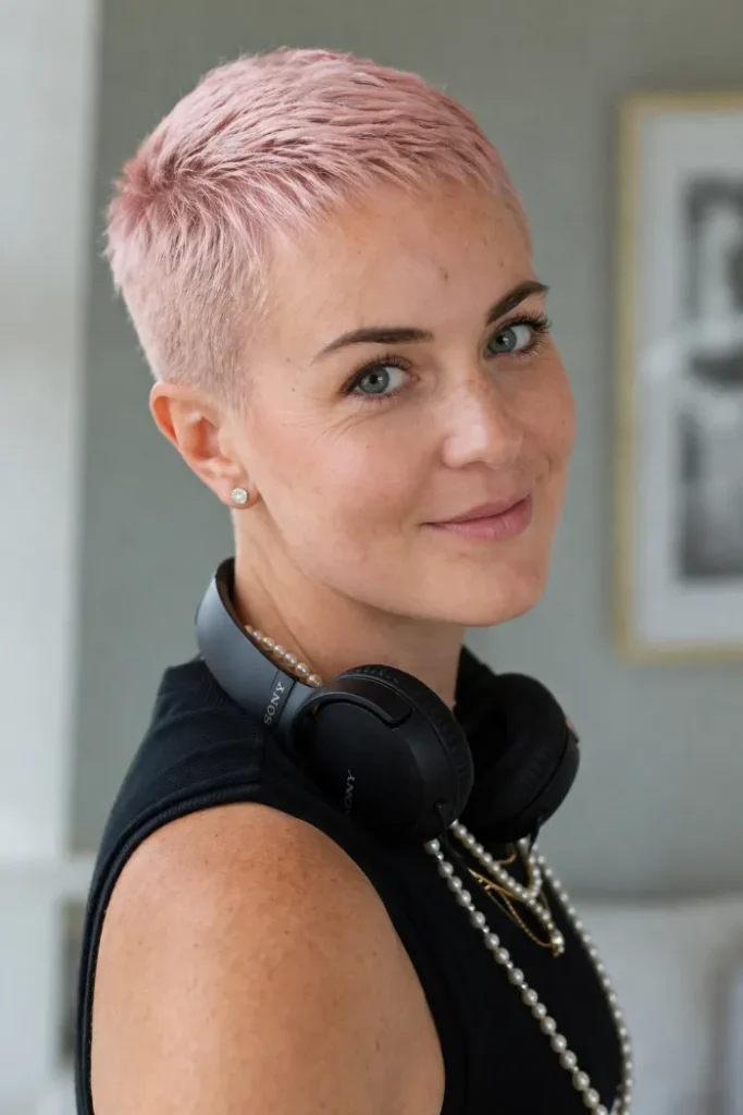 This is nearly a buzz cut, but the soft rose color makes it feel playful and gentle. The even short length means there’s almost no daily styling needed.