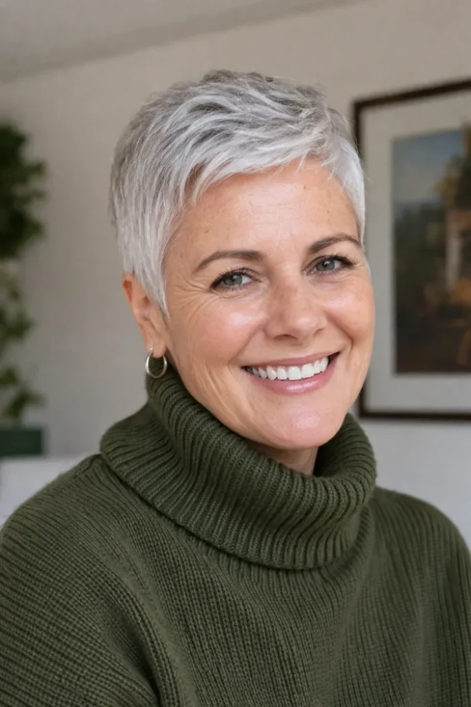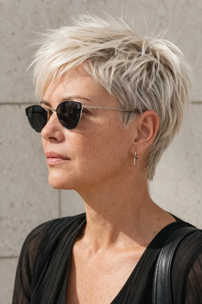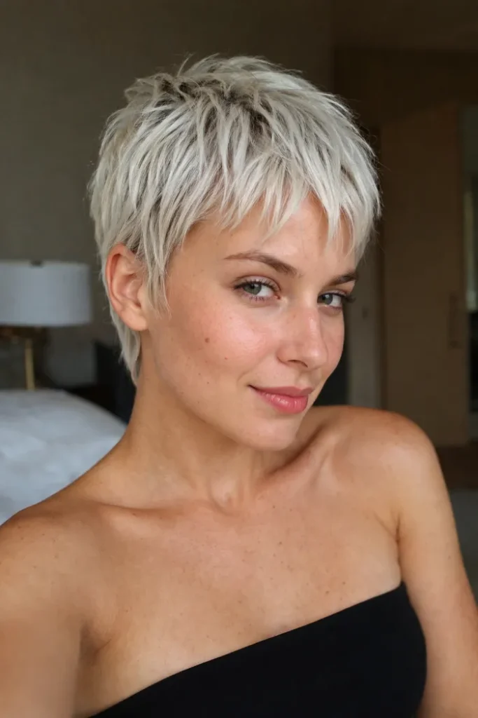 The shorter sides keep it balanced and easy around the ears. For flexible Short Pixie Cut Ideas, ask for a longer textured top with shorter sides and a soft white blonde color.