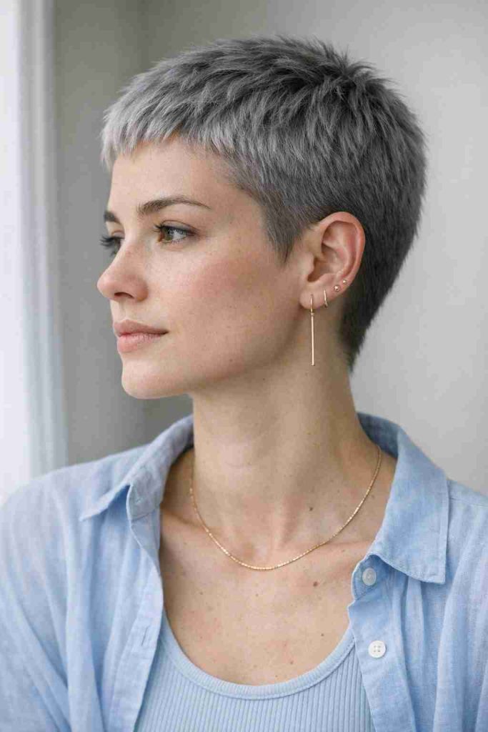 Ash gray gives it a cool, muted finish that looks stylish without being loud. For minimal but trendy Short Pixie Cut Ideas, ask for tiny textured layers and a clean outline.