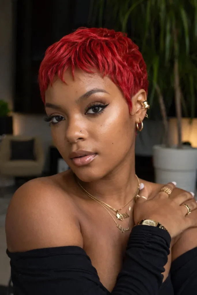 It’s a great pick if you want short hair that still feels fun and expressive. For standout Short Pixie Cut Ideas, ask for a very short textured crop with a bright red shade.