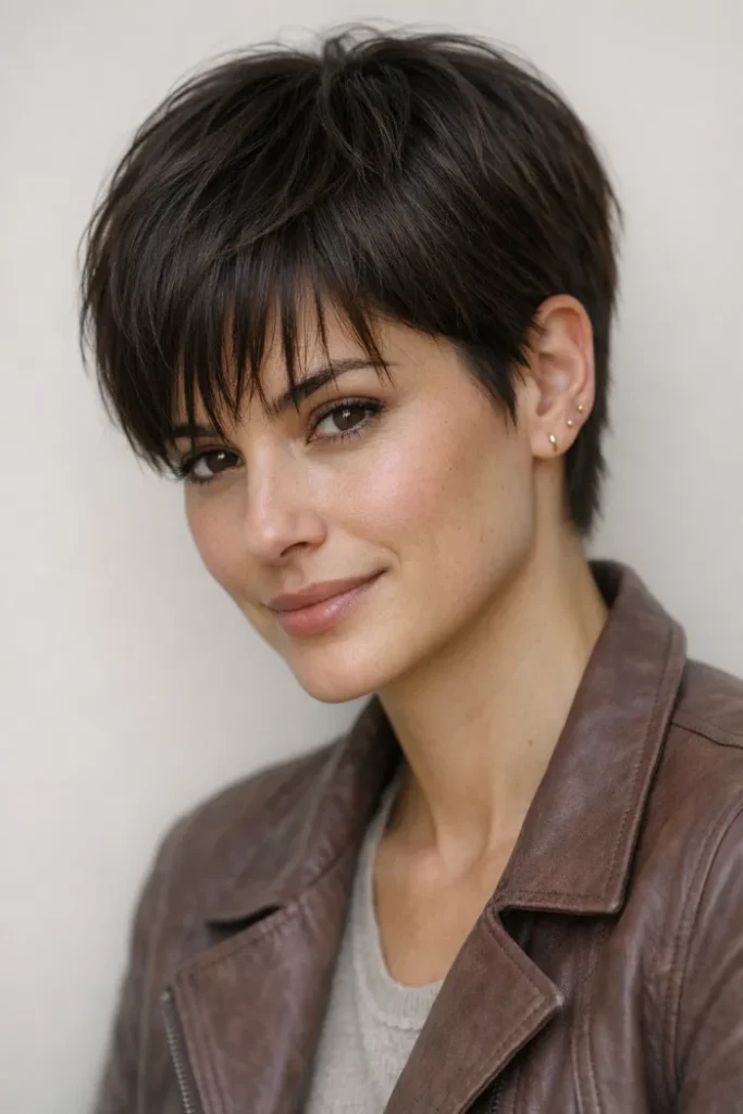 The deep espresso shade gives it a sleek, polished feel without looking too done-up. For this type of Short Pixie Cut Ideas, ask for a longer textured top and sides that are close but not super tight.