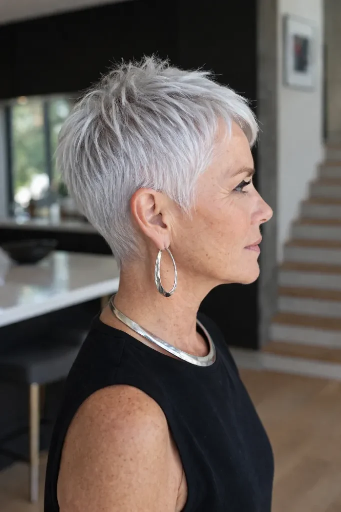The frosted silver color keeps it light and refined from every angle. For Short Pixie Cut Ideas like this, ask for a tidy nape taper and soft volume at the top.