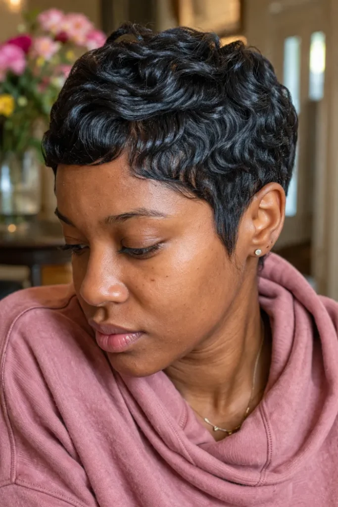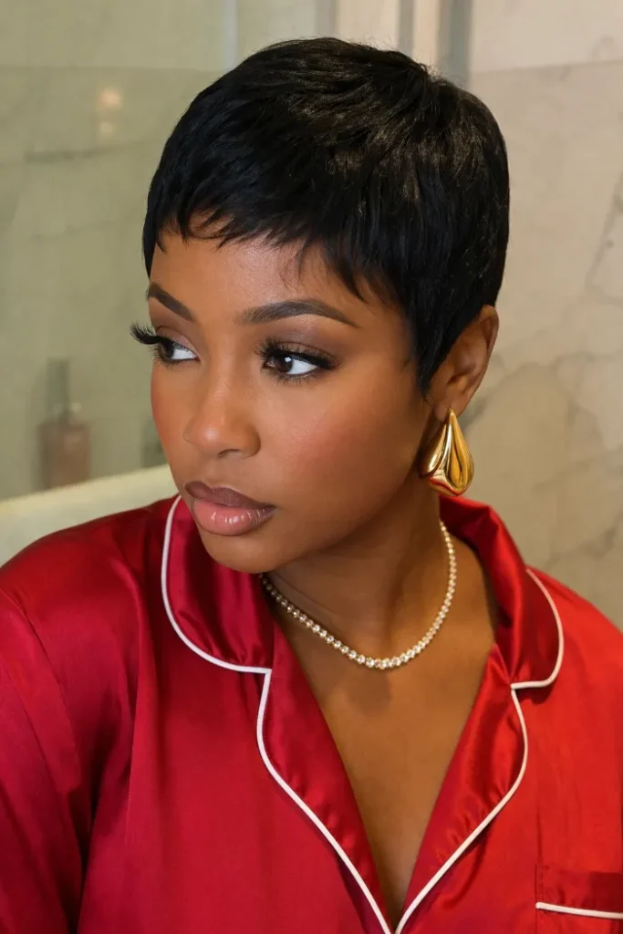 The sides stay close, keeping the shape compact and clean. For glamorous Short Pixie Cut Ideas, ask for enough top length to form pin curls and keep the sides neat.