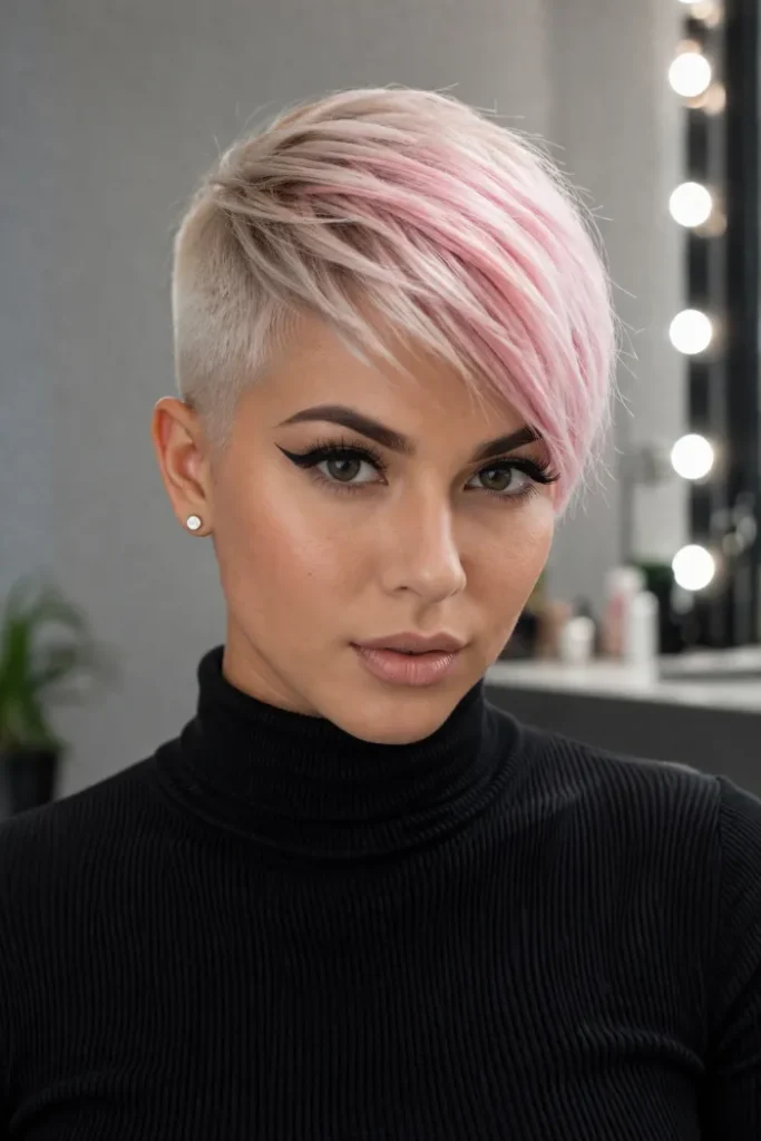 Pastel blush keeps it fun and light, not too intense. If you like creative Short Pixie Cut Ideas, ask for a side-swept long top with a clean undercut underneath.