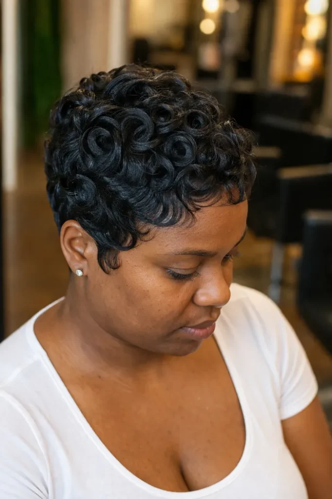 This pixie stands out because the top is styled into defined pin curls. It looks dressed-up and polished, even though the hair is short.