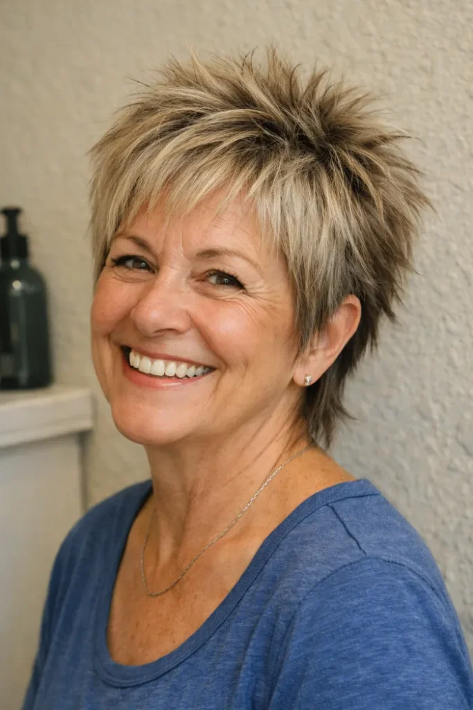 Most Short Shag Haircuts for Women Over 60 look best when the layers are separated. After washing, use light mousse or a root spray, then dry with your fingers to lift the crown. If your hair is wavy, scrunch the ends and air-dry for a soft, lived-in finish.