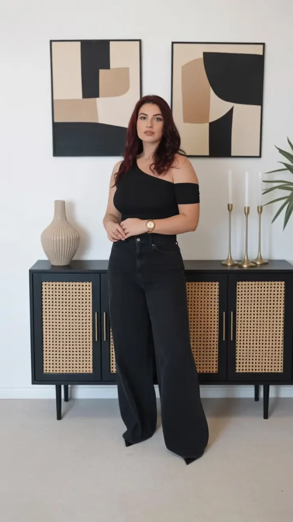 A one-shoulder black top with wide-leg denim creates a strong silhouette that feels modern and flattering. The asymmetric neckline adds personality without going over the top.