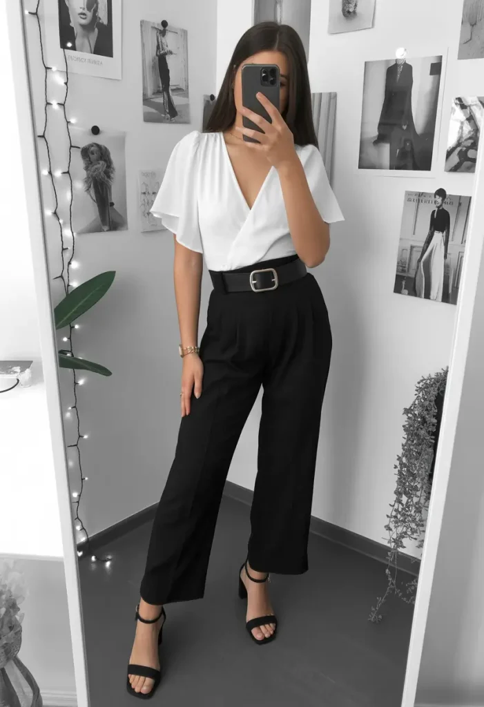 A wrap-style blouse with flutter sleeves and tailored trousers feels refined and timeless. The black and white combination always looks polished for a dinner setting.
