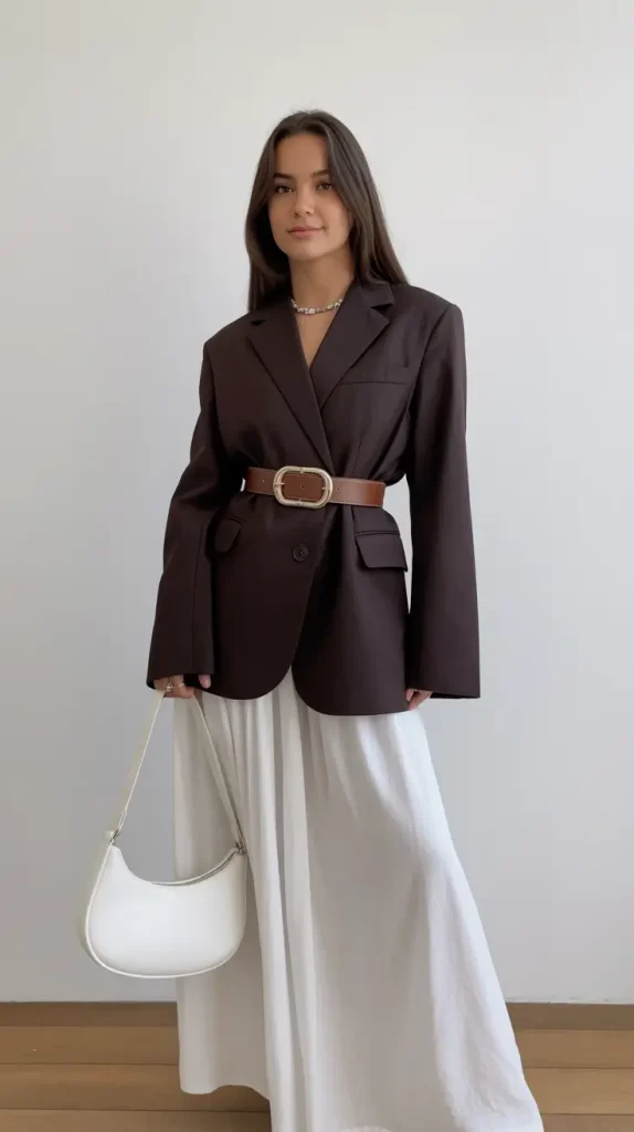 A belted chocolate blazer over a white flowing skirt feels strong, polished, and very sophisticated. The contrast between the rich blazer and the light skirt looks intentional and elegant.