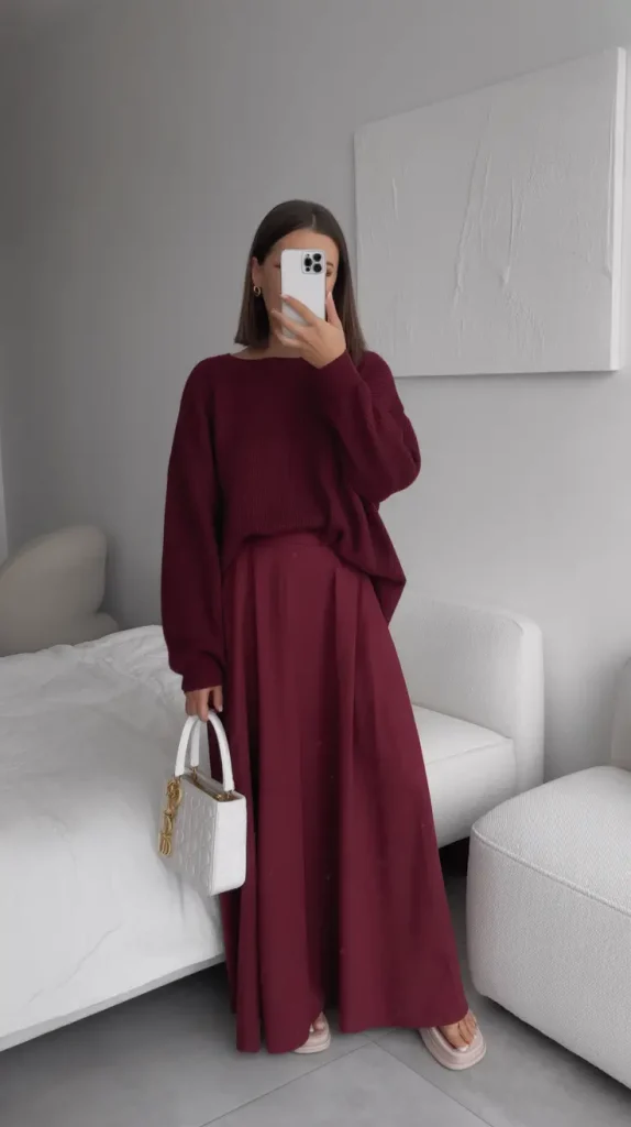 A cozy knit top with a matching flowing skirt in burgundy feels warm, calm, and quietly luxurious. It’s one of those spring birthday outfit ideas that’s comfortable but still feels special.