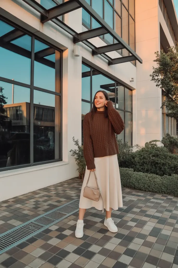 A cable knit sweater with a cream midi skirt feels soft and romantic, like spring sunlight wrapped into an outfit. White sneakers keep it relaxed and walkable.