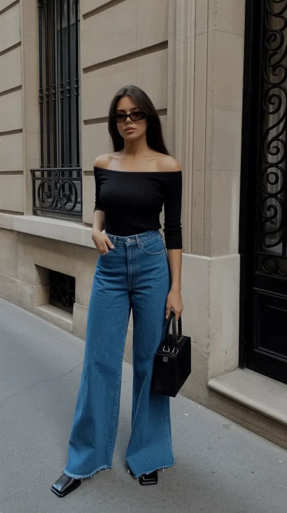 A black off-shoulder top with wide-leg blue denim feels effortless and feminine. It’s a simple outfit that still has presence and shape.