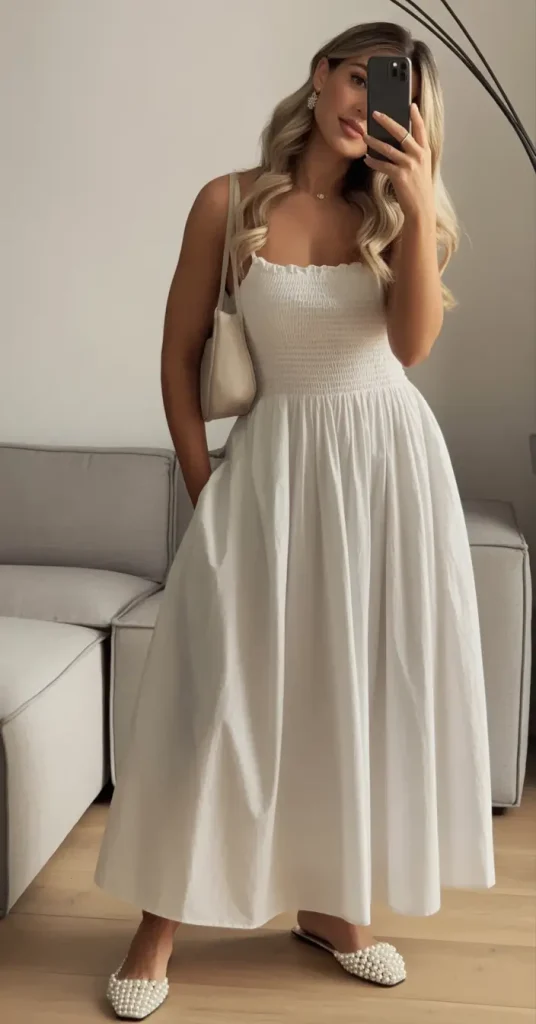A white midi dress is one of those pieces that instantly looks clean and fresh. The smocked top feels secure, and the full skirt moves nicely when you walk.