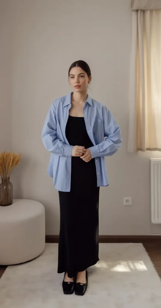 A black maxi dress is simple and flattering, and the oversized blue shirt adds a fresh pop of color. This is great for work, travel, or daily plans.