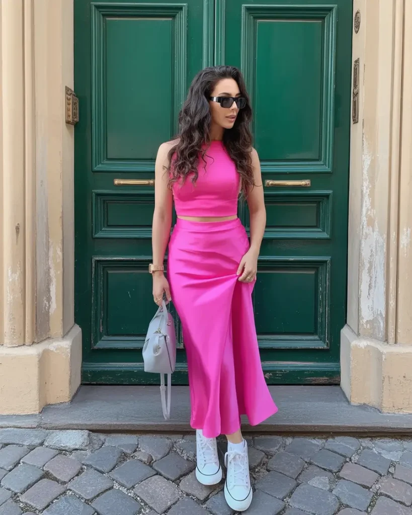 A bright matching set gives you a bold “dress-like” look with very little effort. Hot pink feels energetic and modern for spring.