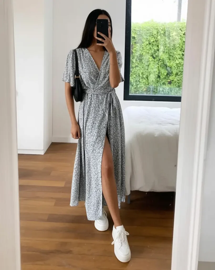15. Soft wrap dress with sneakers for effortless weekend comfort